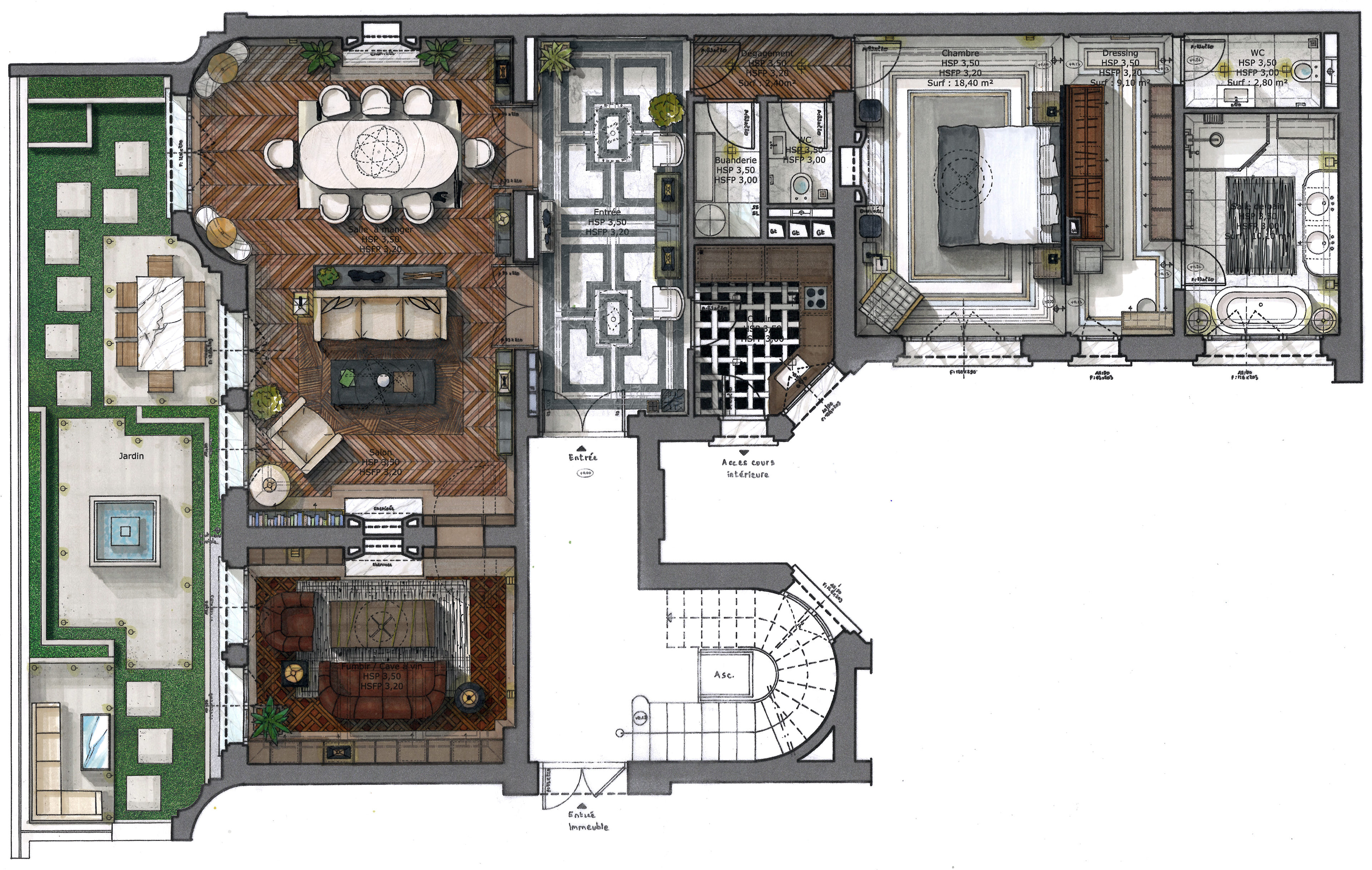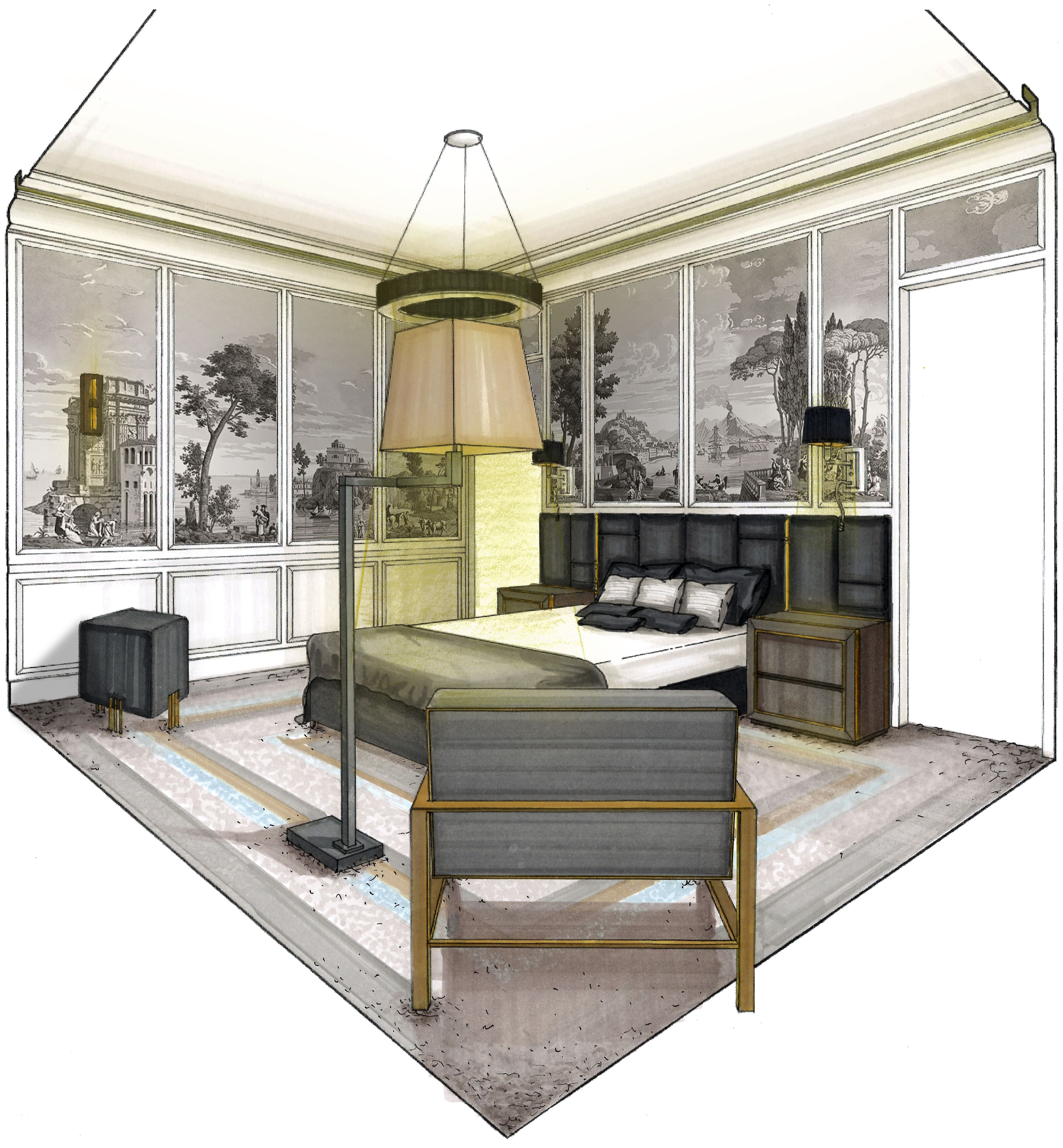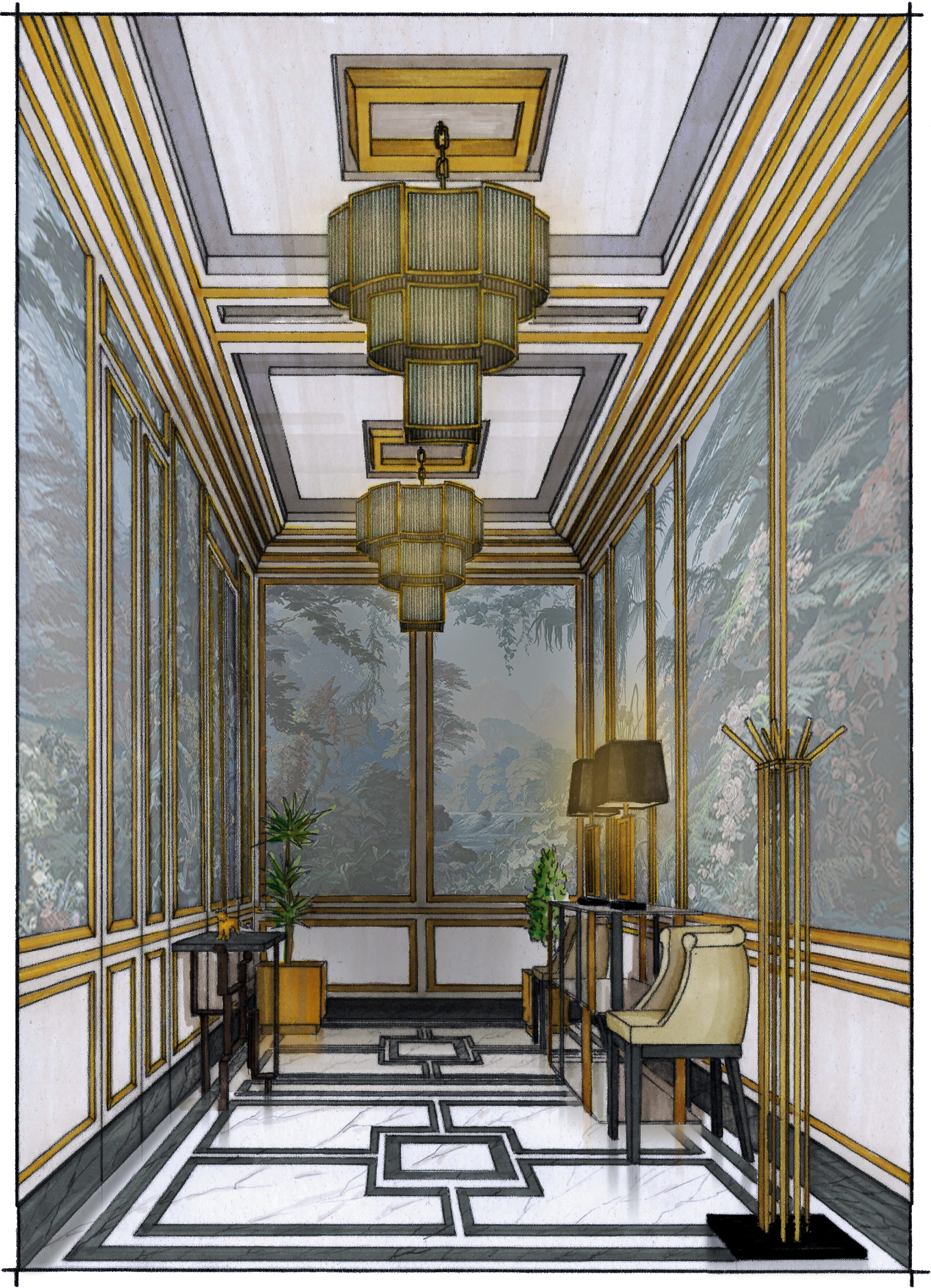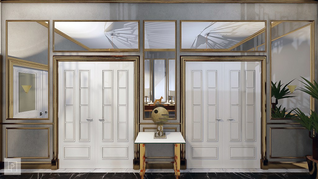 Le hall d’entrée a été pensé comme un véritable écrin de bienvenue. Le sol en marbre à motifs géométriques noirs et blancs contraste subtilement avec les miroirs encadrés de dorures, donnant une impression de grandeur et de profondeur. Les appliques en laiton brossé et le mobilier sur mesure témoignent de l’attention portée aux finitions et de la volonté de créer un passage à la fois majestueux et fonctionnel, en accord avec l’esprit recherché de l’ensemble de l’appartement.