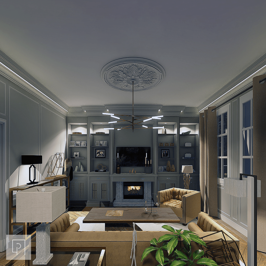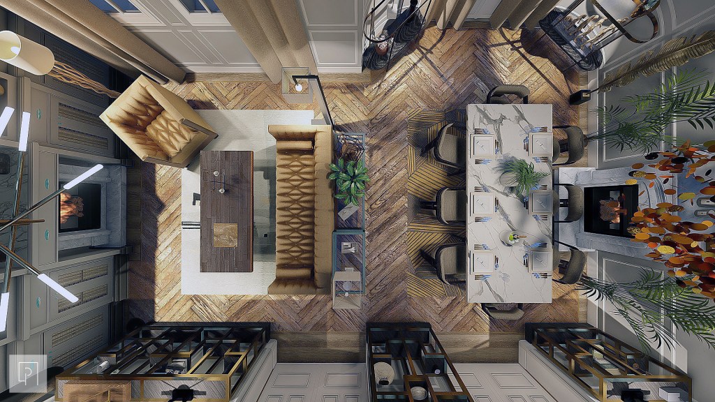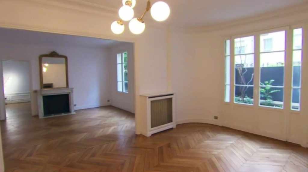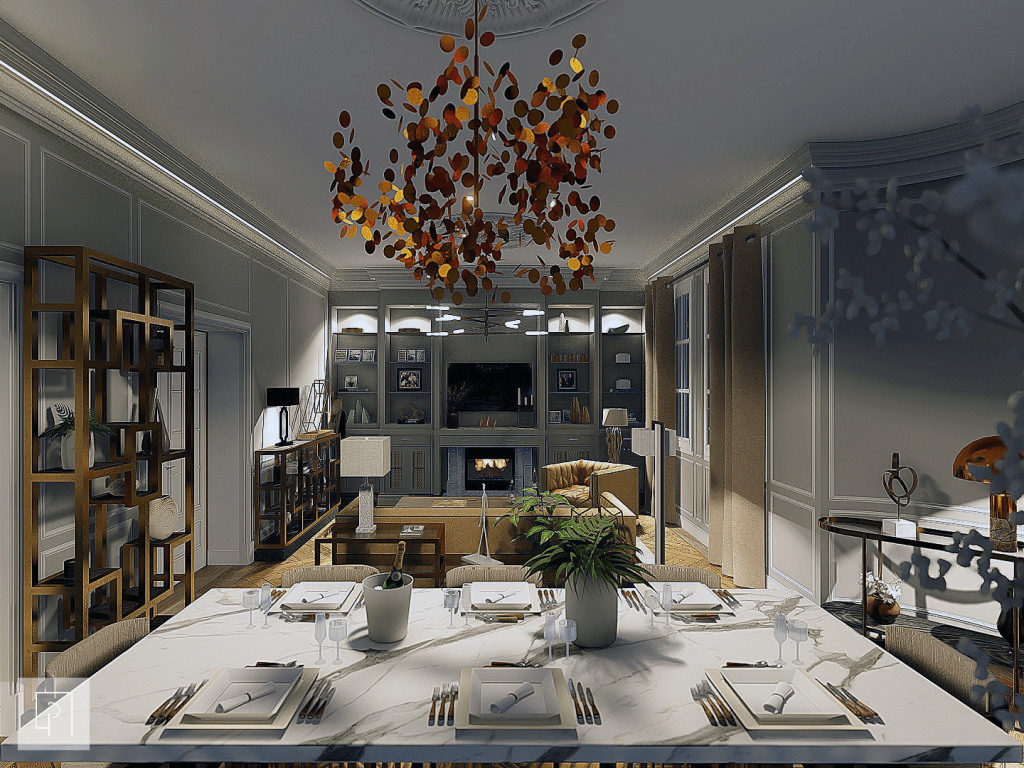 Le séjour, véritable pièce maîtresse de l’appartement, se distingue par ses plafonds ornés de moulures et ses murs habillés de boiseries sur mesure. Le mobilier, soigneusement sélectionné, alterne entre pièces contemporaines et références au design d’époque, créant un dialogue harmonieux entre tradition et modernité. Un lustre central en verre soufflé, suspendu au-dessus de la table à manger, capte la lumière pour illuminer l’ensemble de l’espace, tandis que le marbre blanc et les touches de bois chaud apportent une dimension à la fois luxueuse et chaleureuse.