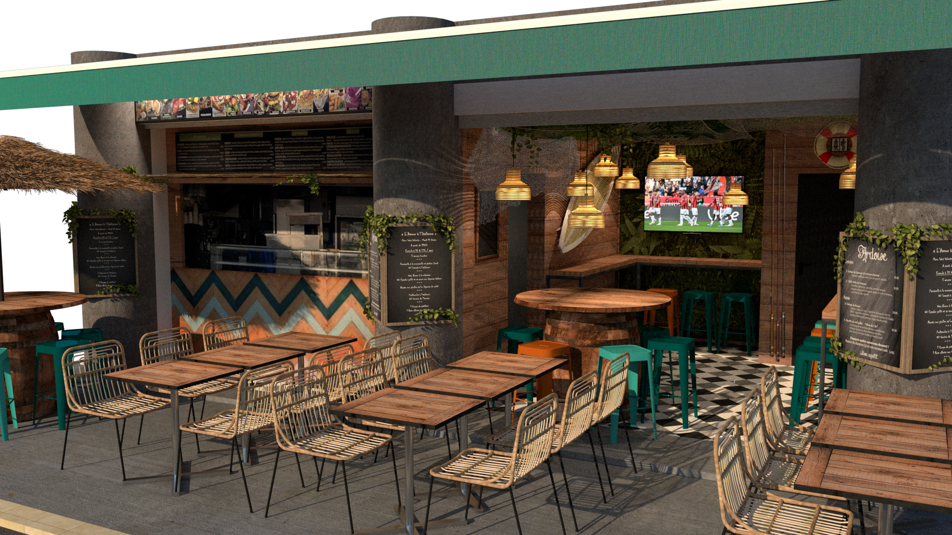 Une seconde version propose une ambiance plus rustique, avec un mobilier et une devanture réalisés en palettes de bois, créant un effet artisanal et naturel. Les couleurs plus chaudes et l’éclairage doux renforcent l’atmosphère chaleureuse. La verdure ajoute une touche de fraîcheur, apportant un équilibre entre authenticité et confort.