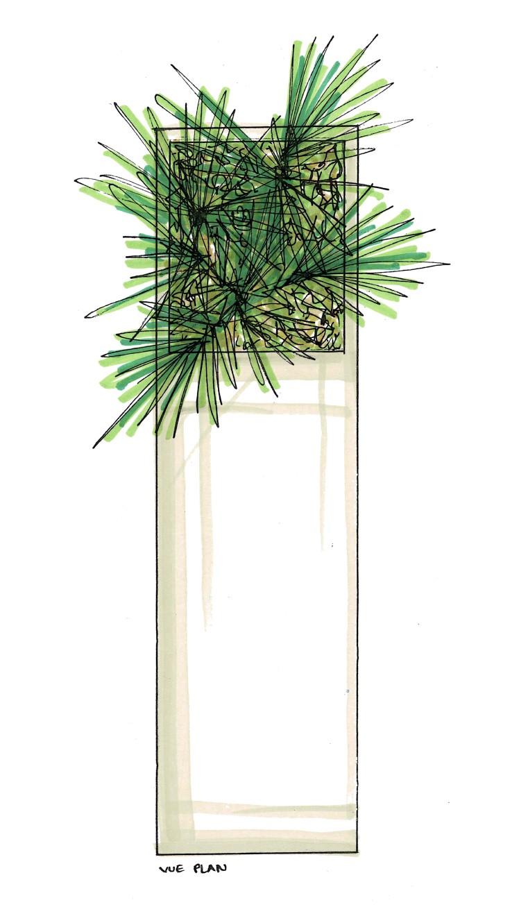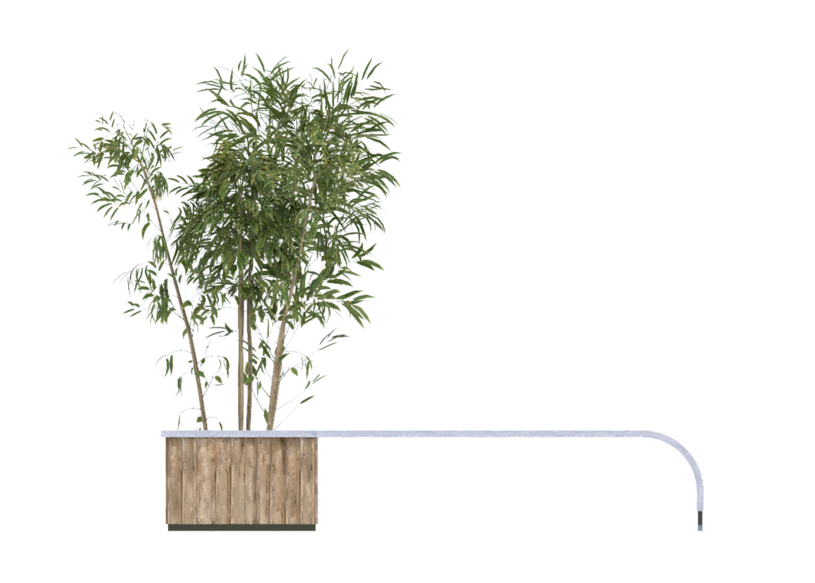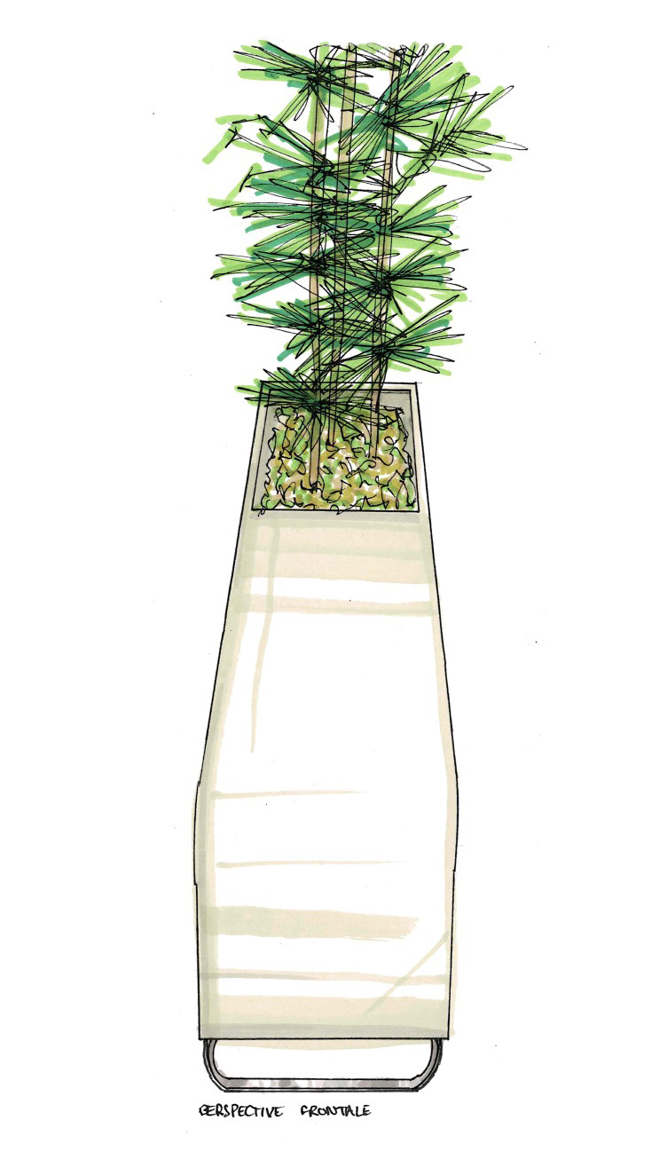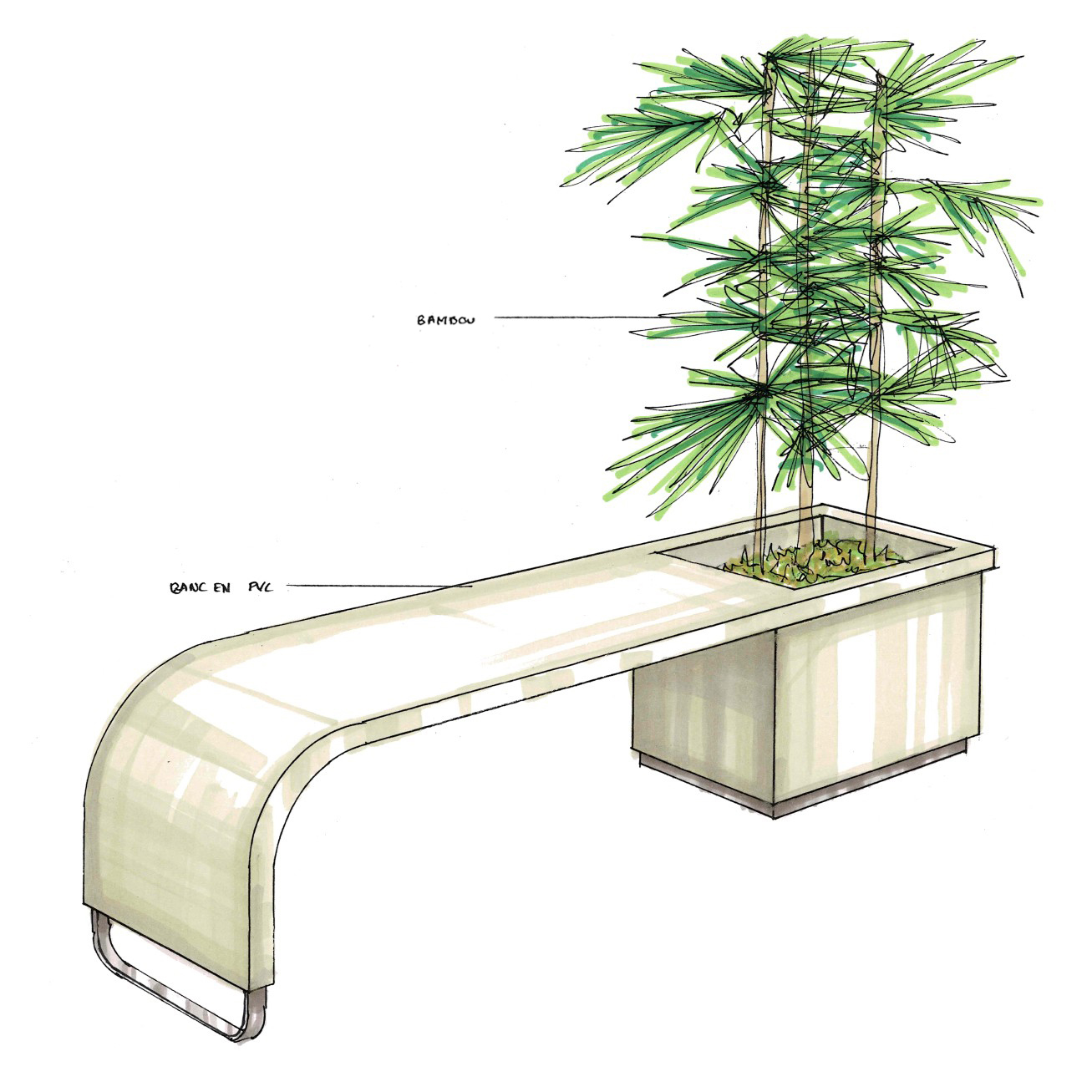 Le mobilier se caractérise par un design minimaliste et épuré, tant dans ses formes que dans le choix des matériaux, créant une assise à la fois fonctionnelle et propice à la lecture, au repos. L’assise se repose sur un pot en bois permetant d’y planter de la végétation.