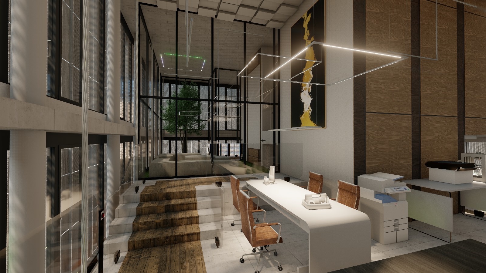 L’aménagement utilise des matériaux chaleureux : sol en bois naturel, panneaux muraux en bois clair, plafond à dalles géométriques blanches avec éclairage intégré. Les meubles en bois et métal, ainsi que les banquettes en tissu neutre, créent une ambiance moderne et apaisante.